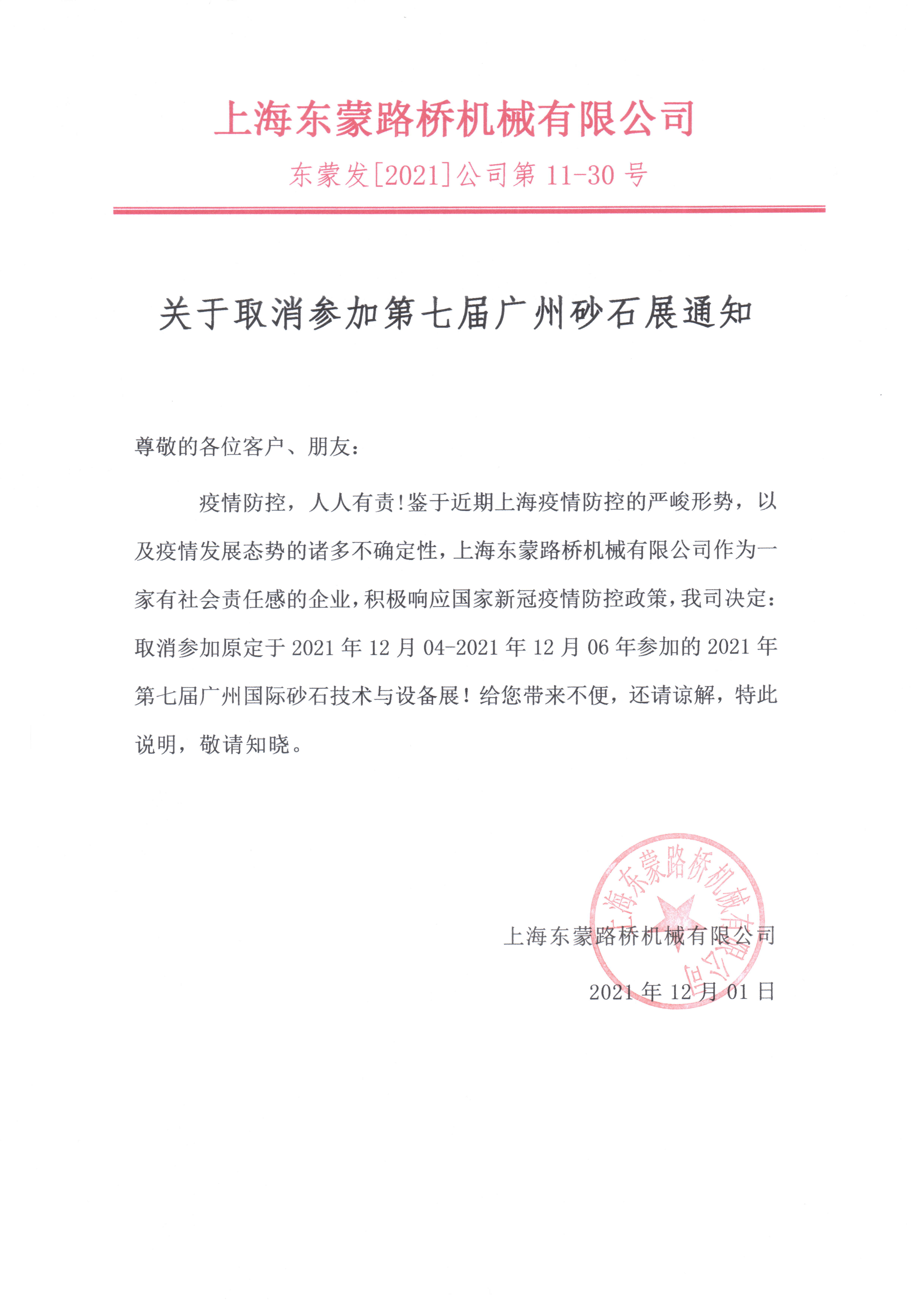 由于近期新型冠狀病毒的影響,結(jié)合防疫需要,避免不可控因素帶來的風(fēng)險,我司經(jīng)研究決定,正式取消原定于12月04日-12月06日在廣州舉辦的“2021第七屆廣州國際砂石技術(shù)與設(shè)備展”。在此十分感謝各位一直關(guān)注東蒙的用戶,給您帶來不便,還請諒解,特此說明,敬請知曉。